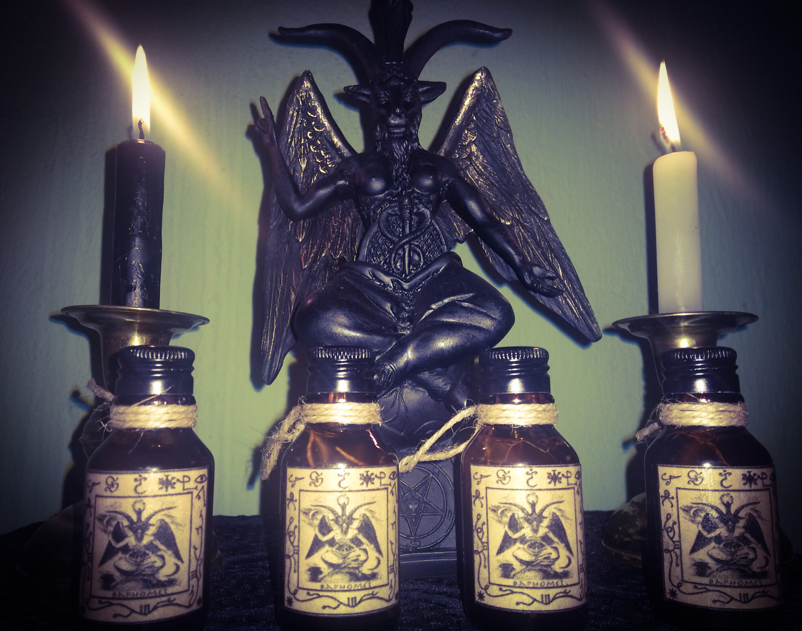 Esse blend é um óleo espiritual que começou a ser produzido num sábado devido a sua associação com Saturno, no momento entre o crepúsculo e a noite, assim criando um ambiente mágico desde a sua concepção e em seu uso. Use este óleo para se auto ungir ou para trabalhos mágicos,em um queimador de óleo durante a meditação. Tem uma fragrância equilibrada que estimula a mente e o espírito. A intenção desta Unção é criar equilíbrio entre nossa luz e escuridão, dissolver o medo do desconhecido e promover manifestações em nossos trabalhos mágicos. A Unção de Baphomet é um perfume equilibrado com tons terrosos. Possui uma base de patchouli que capta a essência do elemento terra, e a isso se somam as qualidades vibrantes da lavanda, o aroma sobrenatural da trombeta de anjo e o aroma escuro e feminino do jasmim. Também incluí nesta receita a resina de sangue de dragão que pode ser usado em feitiços para aumentar a coragem e proteger aqueles que saem para enfrentar o perigo e além de tudo para atrair dinheiro e sorte e assim aumentar o poder pessoal. Existe mais ingredientes nessa receita que não foi divulgado para mante-la sagrada.