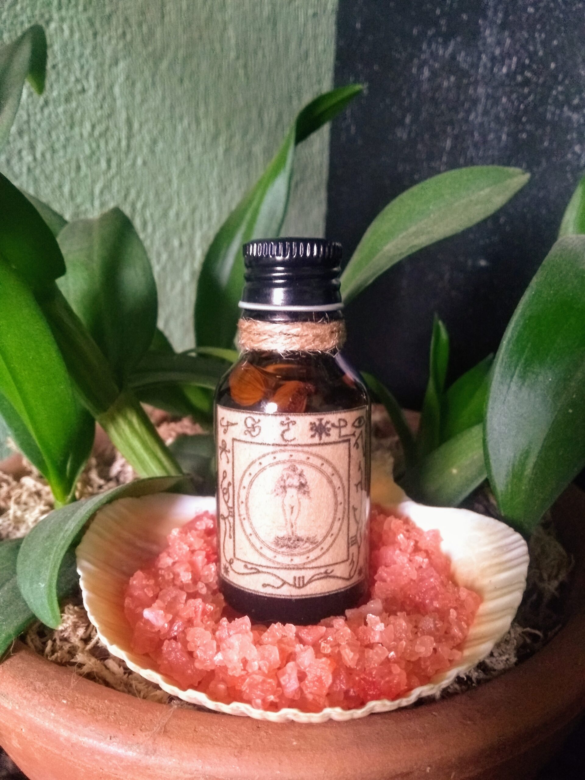 Use como perfume e em seus feitiços de amor, e também em pontos específicos do corpo. Acompanha folheto com ritual de invocação, sais de banho para sedução e orientações de uso.